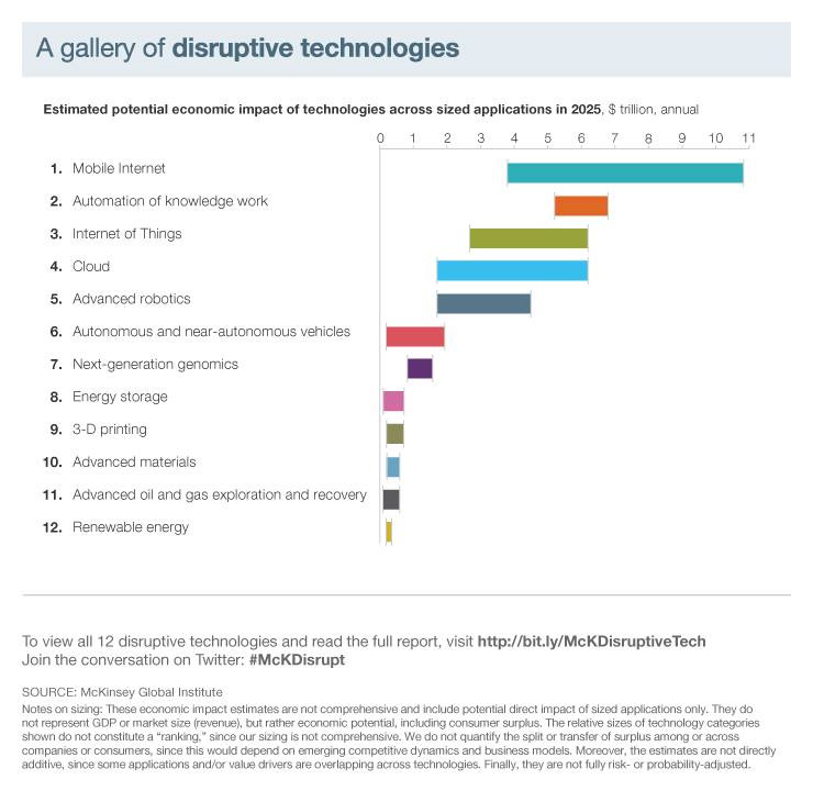 McKinsey, credo questa settimana, ha pubblicato una classifica con l’impegno di spesa previsto in 12 Innovazioni dirompenti per il 2025. Anche se è un po’ paradossale come studio (perché la dirompenza è proprio legata all’imprevedibilità), trovo che lo studio (che risulterà sicuramente sbagliato nel 2025) fornisce delle indicazioni molto interessanti sui grandi trend dell’economia e della ricerca globale.